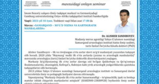 Imom Buxoriy xalqaro ilmiy-tadqiqot markazida Germaniyaning Gamburg universiteti huzuridagi Osiyo-Afrika tadqiqotlari instituti bilan hamkorlikda “Zarafshon vohasi madaniy boyliklari” turkumida navbatdagi onlayn seminar boʻlib oʻtdi. Unda Markaz xodimlari, yurtimiz va xorijdagi ilmiy muassasalar tadqiqotchilari, shuningdek, Germaniya, Turkiya va AQSH kabi davlatlardan olimlar ishtirok etdi. Seminarda Madaniy meros agentligi Yahyo Gʻulomov nomidagi …