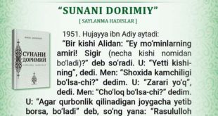 1951. Hujayya ibn Adiy aytadi: “Bir kishi Alidan: “Ey moʻminlarning amiri! Sigir (necha kishi nomidan boʻladi)?” deb soʻradi. U: “Yetti kishining”, dedi. Men: “Shoxida kamchiligi boʻlsa-chi?” dedim. U: “Zarari yoʻq”, dedi. Men: “Choʻloq boʻlsa-chi?” dedim. U: “Agar qurbonlik qilinadigan joygacha yetib borsa, boʻladi” deb, soʻng yana: “Rasululloh sollallohu alayhi vasallam …