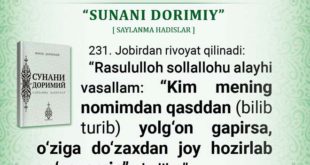 231. Jobirdan rivoyat qilinadi: “Rasululloh sollallohu alayhi vasallam: “Kim mening nomimdan qasddan (bilib turib) yolgʻon gapirsa, oʻziga doʻzaxdan joy hozirlab qoʻyaversin”, dedilar”. Imom Dorimiyning “Sunani Dorimiy” kitobidan.