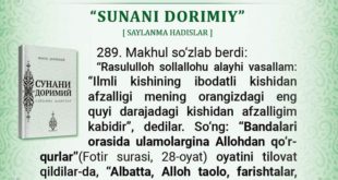 289. Makhul soʻzlab berdi: “Rasululloh sollallohu alayhi vasallam: “Ilmli kishining ibodatli kishidan afzalligi mening orangizdagi eng quyi darajadagi kishidan afzalligim kabidir”, dedilar. Soʻng: “Bandalari orasida ulamolargina Allohdan qoʻrqurlar”(Fotir surasi, 28-oyat) oyatini tilovat qildilar-da, “Albatta, Alloh taolo, farishtalar, osmonlar va Yer ahli hamda dengizdagi baliqlar odamlarga yaxshilikni oʻrgatadigan kishiga salavot aytadi”, …