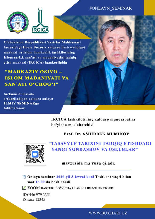 ✅ Oʻzbekiston Respublikasi Vazirlar Mahkamasi huzuridagi Imom Buxoriy xalqaro ilmiy-tadqiqot markazi va Islom hamkorlik tashkilotining Islom tarixi, san’ati va madaniyatini tadqiq etish markazi (IRCICA) hamkorligida «MARKAZIY OSIYO – ISLOM MADANIYATI VA SANʼATI OʻCHOGʻI» turkumi doirasida oʻtkaziladigan xalqaro onlayn ILMIY SEMINARga taklif etamiz.