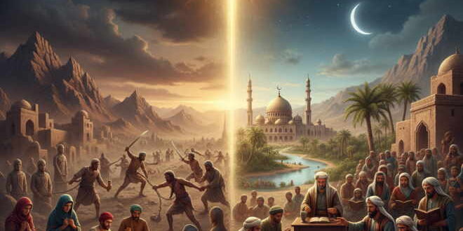 Арабистон ярим ороли VII асрга келиб ҳар жиҳатдан жаҳолатга ботган ўлкага айланди. У ерда яшовчи қабила ва элатлар инсон табиатини безовчи гўзал фазилатлардан тамоман узоқлашган эди. Аҳвол шу даражага етган эдики, ҳудудда яшовчи қабилалар бири-бирига ҳужум қилиб, одамларни асир олар, табиийки, асир олинган инсонлар қул қилиб сотилар эди. Бу даврда қулларни сабабсиз ўлдириш одатий ҳолга айланган эди. Шу ва бошқа омиллар туфайли Арабистон ярим ороли разолат ва ахлоқсизлик ўчоғига айланган, оддий халқ эса қашшоқликдан қаттиқ азият чекар эди.