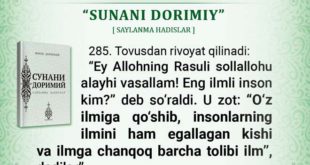 285. Tovusdan rivoyat qilinadi: “Ey Allohning Rasuli sollallohu alayhi vasallam! Eng ilmli inson kim?” deb soʻraldi. U zot: “Oʻz ilmiga qoʻshib, insonlarning ilmini ham egallagan kishi va ilmga chanqoq barcha tolibi ilm”, dedilar”. Imom Dorimiyning “Sunani Dorimiy” kitobidan.