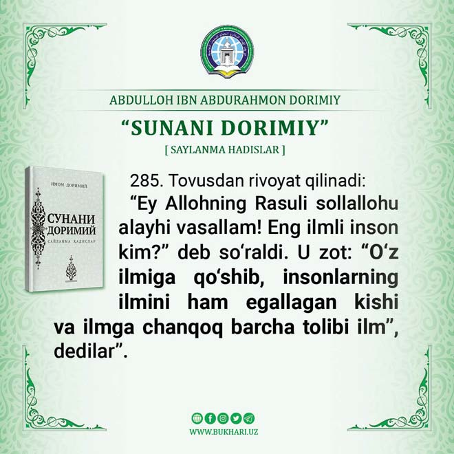 “Ey Allohning Rasuli sollallohu alayhi vasallam! Eng ilmli inson kim?” deb soʻraldi. U zot: “Oʻz ilmiga qoʻshib, insonlarning ilmini ham egallagan kishi va ilmga chanqoq barcha tolibi ilm”, dedilar”.