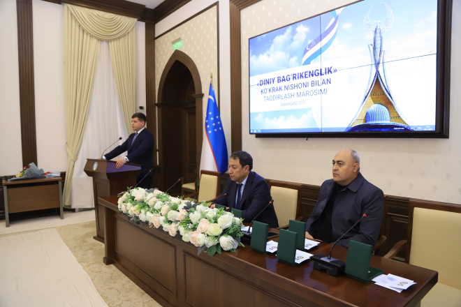 Вилоятдаги қатор муассасаларнинг диний-маърифий соҳада самарали меҳнат қилиб, жамиятда бағрикенглик, ўзаро ҳурмат ва мафкуравий барқарорлик тамойилларини мустаҳкамлашга ҳисса қўшаётган вакиллари “Диний бағрикенглик” кўкрак нишони билан тақдирланди.